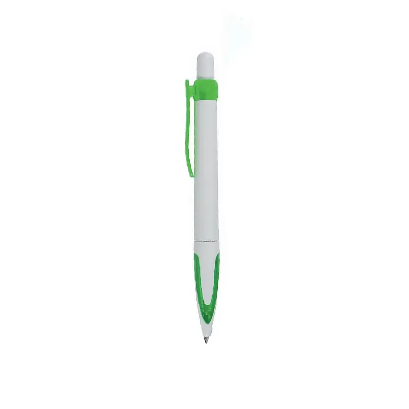 Bolígrafo plástico de cuerpo blanco con clip y grip en colores con transparencia. Apertura con pulsador. Tinta Negra 700 m de longitud de escritura. Zecat