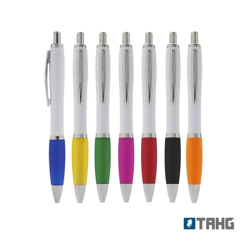 Bolígrafo con cuerpo curvo plástico en acabado blanco. Cuenta con grip de goma de color, clip y botón metálico, mecanismo retráctil y tinta negra.