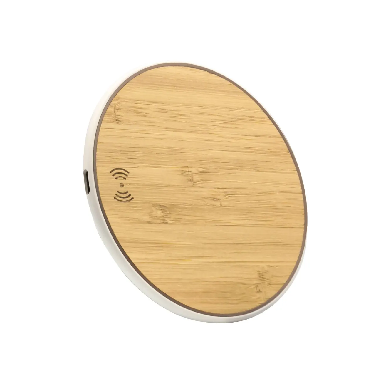 Cargador inalámbrico de bambú 15 W, con diseño ecológico y elegante. Fabricado en bambú natural y ABS resistente, combina estilo y funcionalidad. Compatible con todos los dispositivos Qi, incluye cable USB-C blanco y luces LED indicadoras. Ideal para escritorio, oficina o regalos corporativos sustentables.