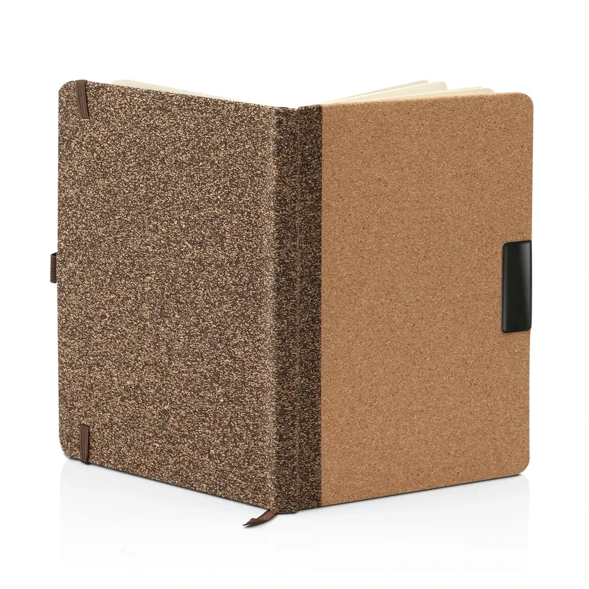 Cuaderno tapas duras forrado en corcho y fibras de granos de café.