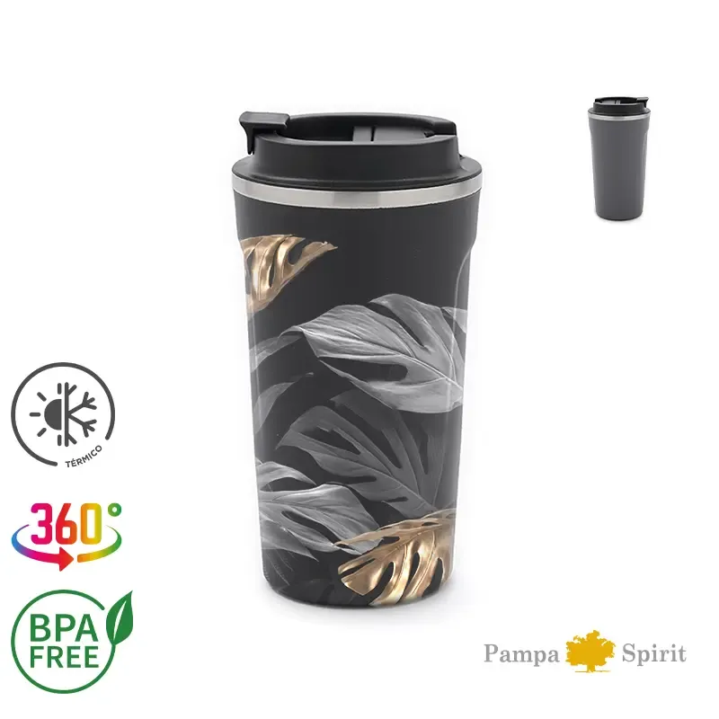 Jarro construido en doble pared de acero inoxidable, esmaltado de color en su exterior y tapa de polipropileno antiderrame. Reutilizable. Dimensiones: 17 x 9 cm | 7 cm de base. Ideal para café, té, bebidas frías o calientes. Capacidad:500ml. Pampa Spirit.