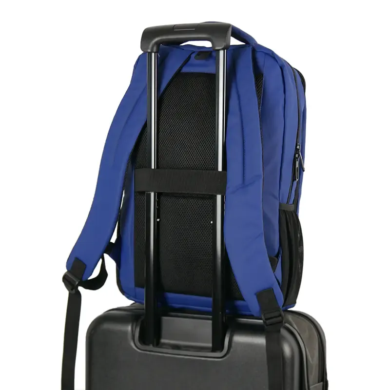 Mochila en colores negro y azul, fabricada con material PU en el exterior y espuma PE con forro completo. Dispone de un compartimento para computadora con correa elástica y velcro y otro amplio compartimento, un bolsillo frontal, dos bolsillos laterales de malla con elástico. Acomoda notebooks de hasta 15,6″. Además, cuenta con respaldo y correas acolchadas para mayor comodidad. Medidas: 44 x 30 x 11 cm. Ideal para quienes necesitan una mochila funcional y organizada para el trabajo o estudios, con espacio suficiente para llevar una notebook y otros artículos esenciales. Pampa Spirit