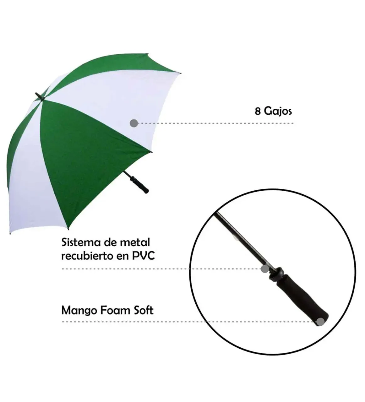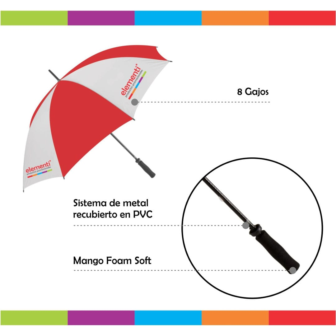 Elegancia y resistencia para tus días de lluvia o de sol. Confeccionado con 8 gajos de alta cobertura, varilla de metal recubierta en PVC y un cómodo mango soft foam que brinda un agarre firme y confortable. Ideal para eventos al aire libre, equipos deportivos o como regalo corporativo. Personalizá tu marca con impresión a todo color sobre los gajos blancos con excelente definición.