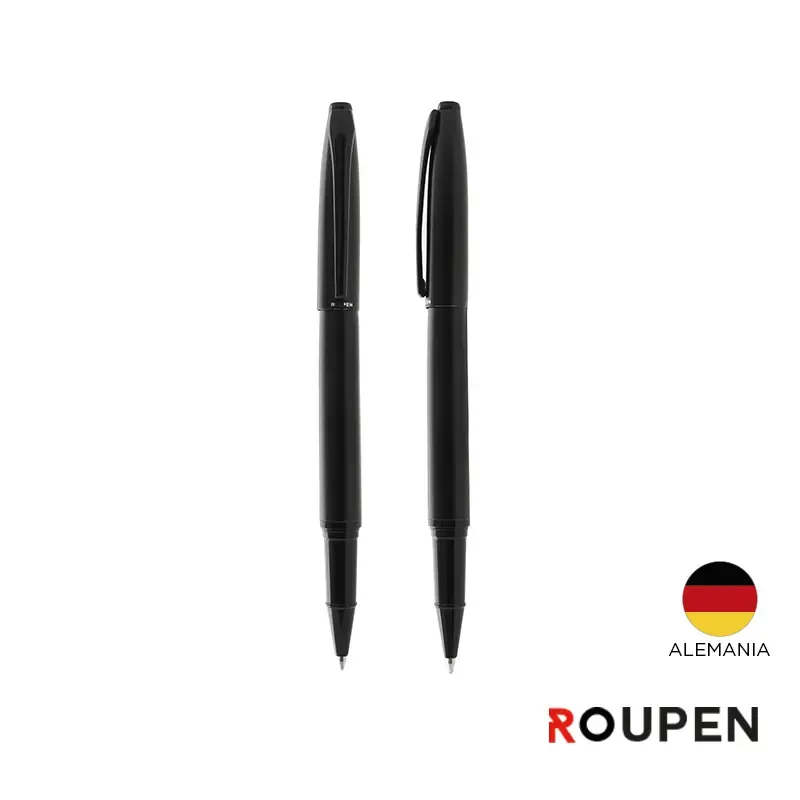 Bolígrafo roller de cuerpo metálico en acero con detalles en negro mate. Cuenta con tinta azul. Medidas: 13,6 x 1,25 cm.