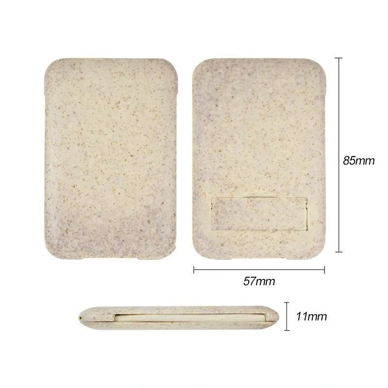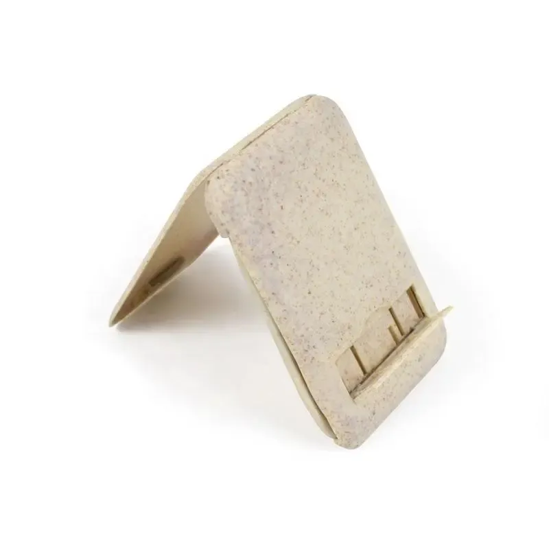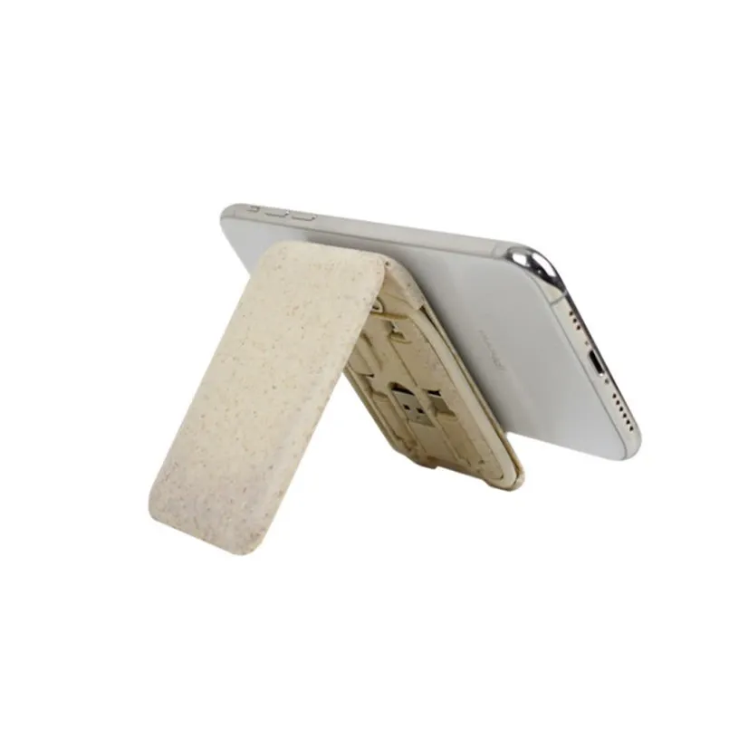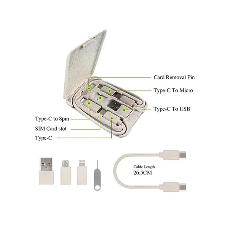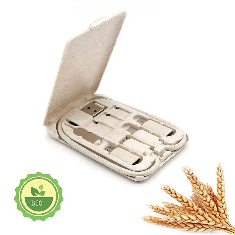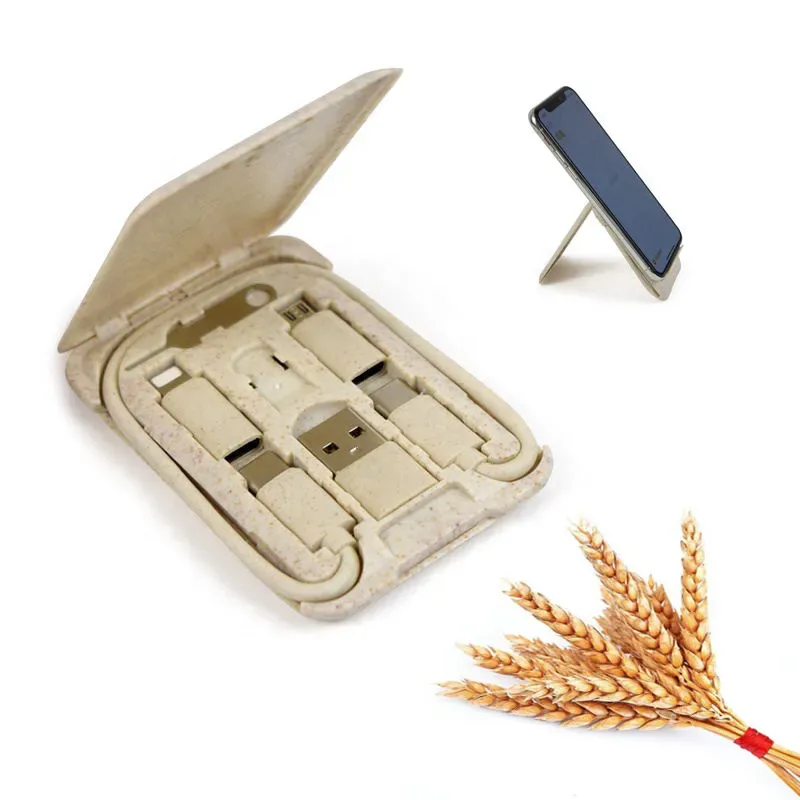 Set de cables ecológicos con soporte para celular, fabricado en paja de trigo (wheat straw), un material biodegradable y resistente que reemplaza los plásticos tradicionales. Un accesorio multifunción ideal para viajes, oficina o regalos corporativos sustentables.
