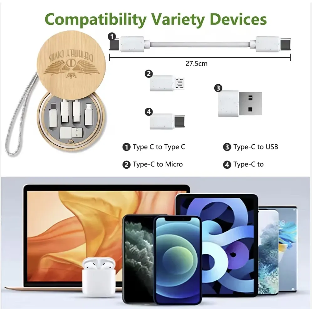 Múltiples conectores: incluye USB-A, USB-C, Lightning y Micro-USB, permitiendo cargar y transferir datos entre distintos dispositivos con un solo set.