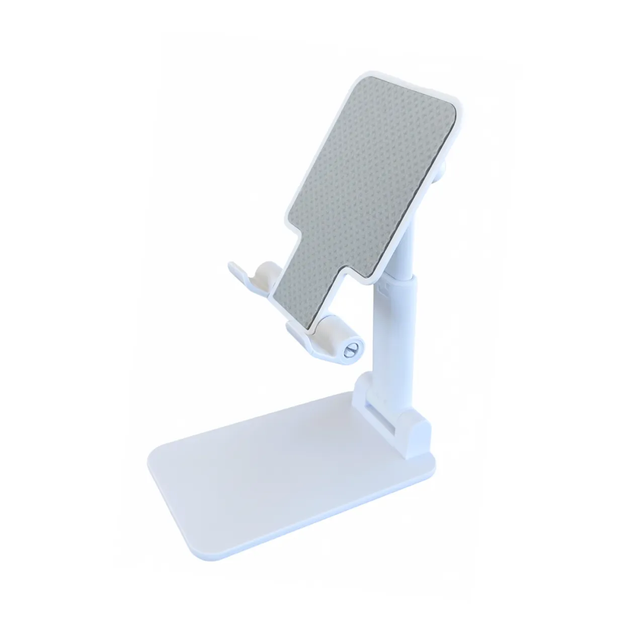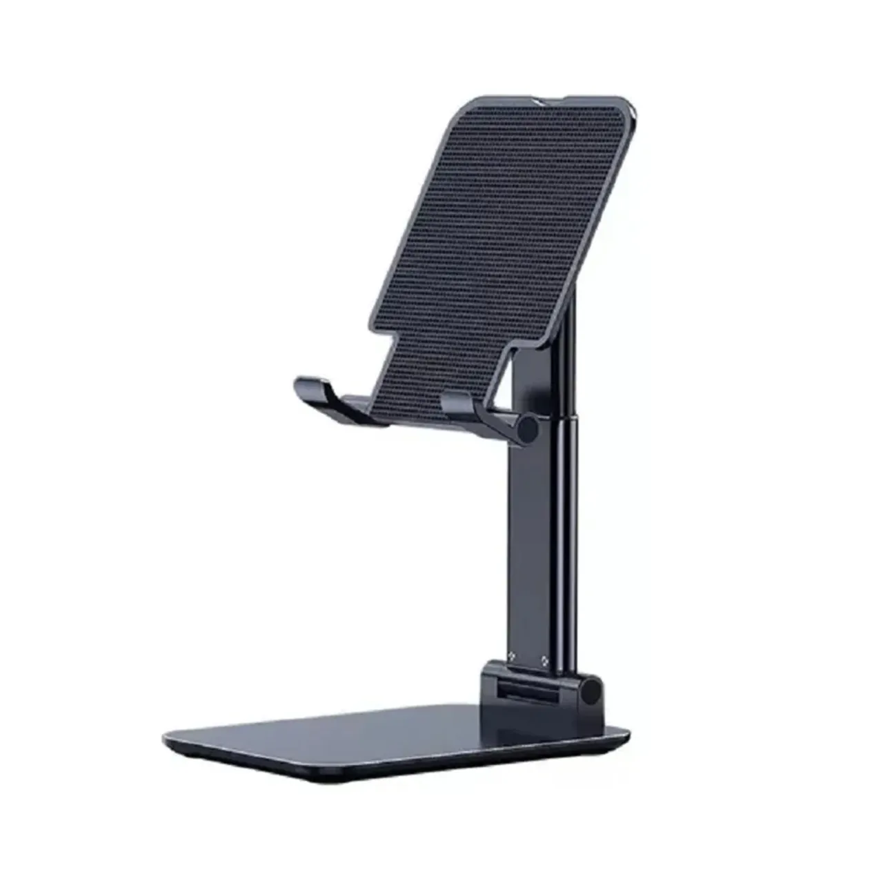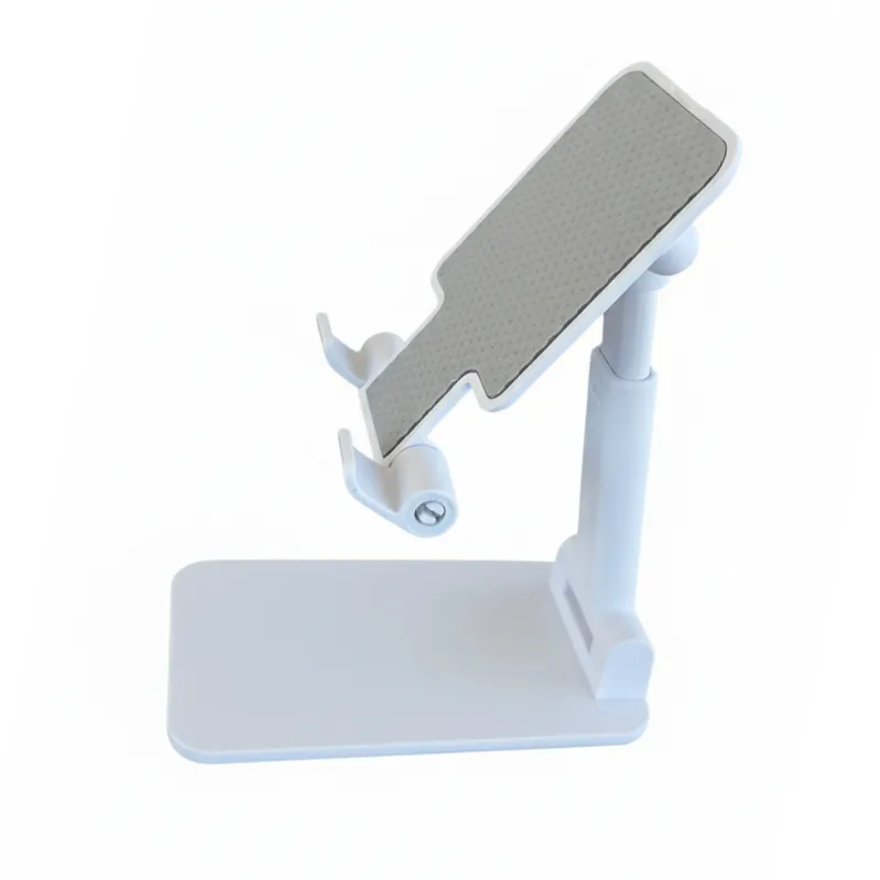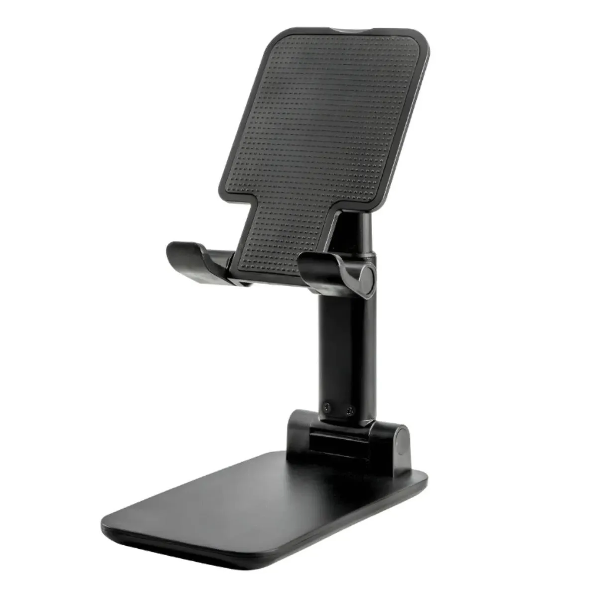 Soporte plegable de escritorio para celular y tablet, con altura e inclinación regulables que permiten una posición cómoda y ergonómica. Su base antideslizante y estructura reforzada brindan gran estabilidad, mientras que su diseño compacto lo hace ideal para videollamadas, oficina, estudio o viajes.