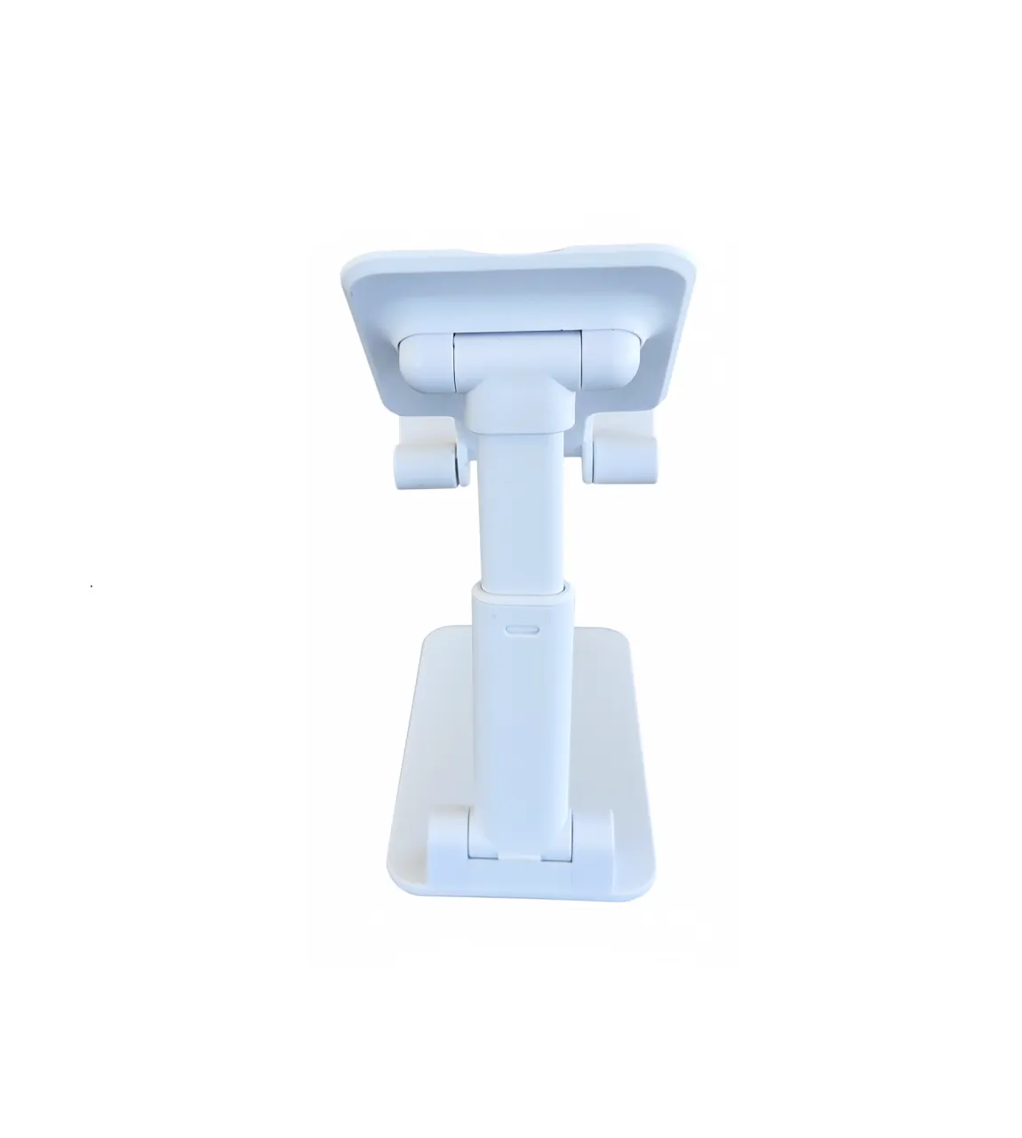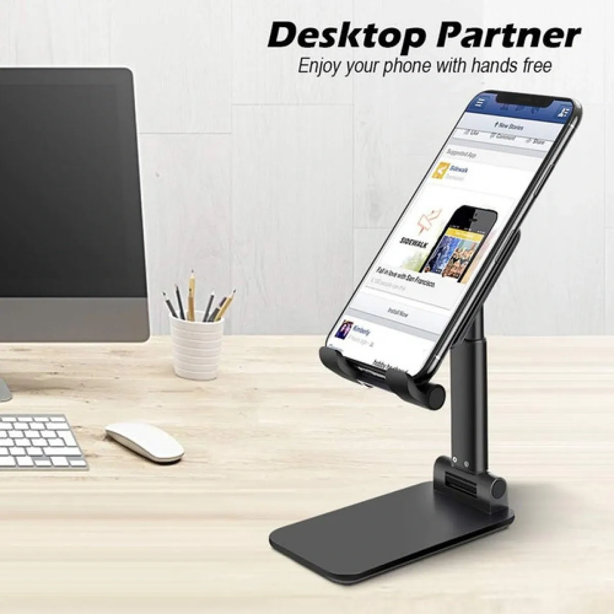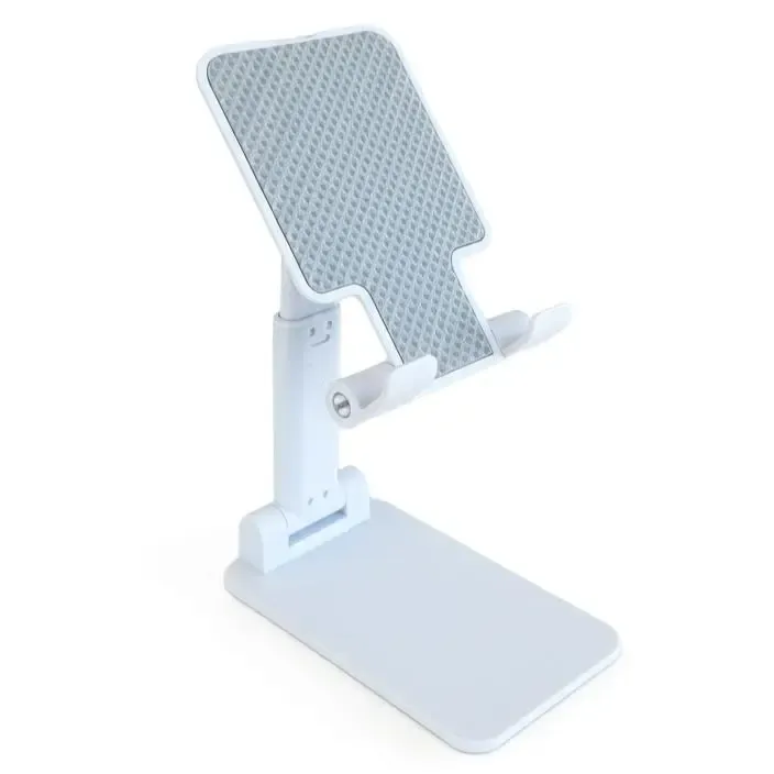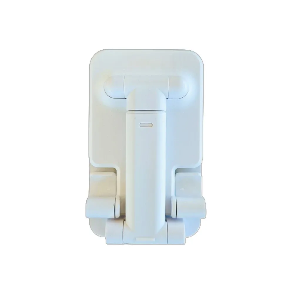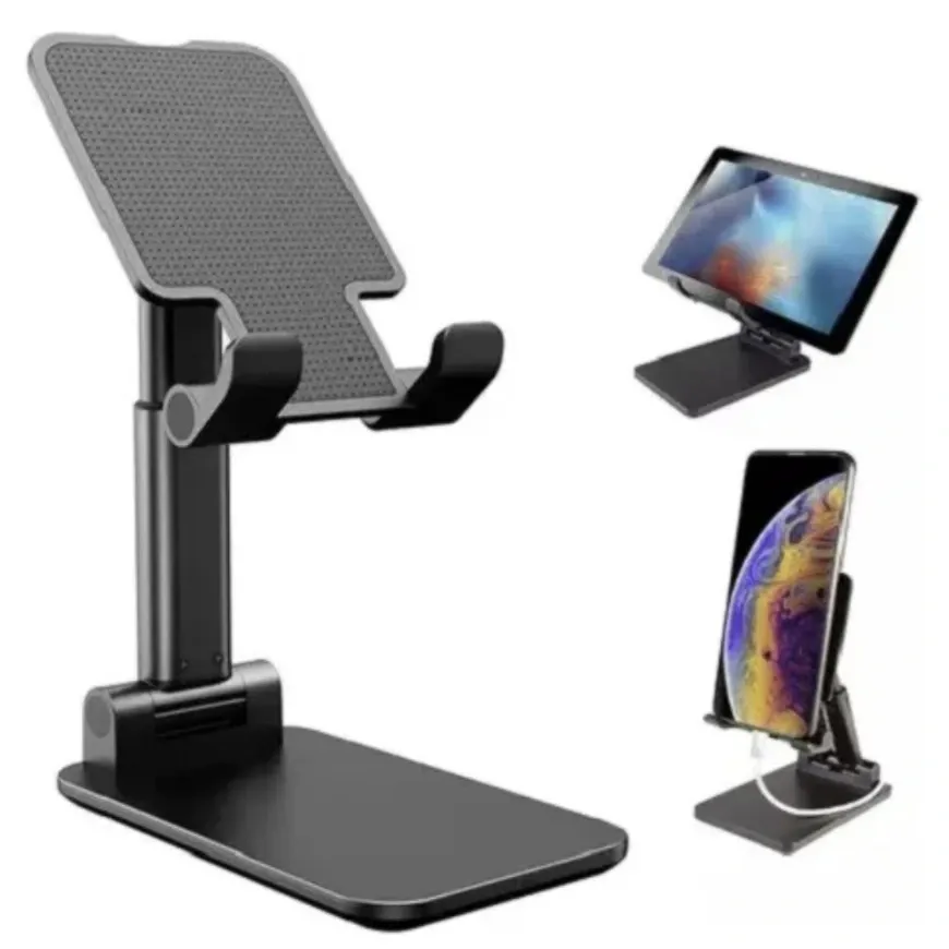 Soporte plegable de escritorio para celular y tablet, con altura e inclinación regulables que permiten una posición cómoda y ergonómica. Su base antideslizante y estructura reforzada brindan gran estabilidad, mientras que su diseño compacto lo hace ideal para videollamadas, oficina, estudio o viajes.