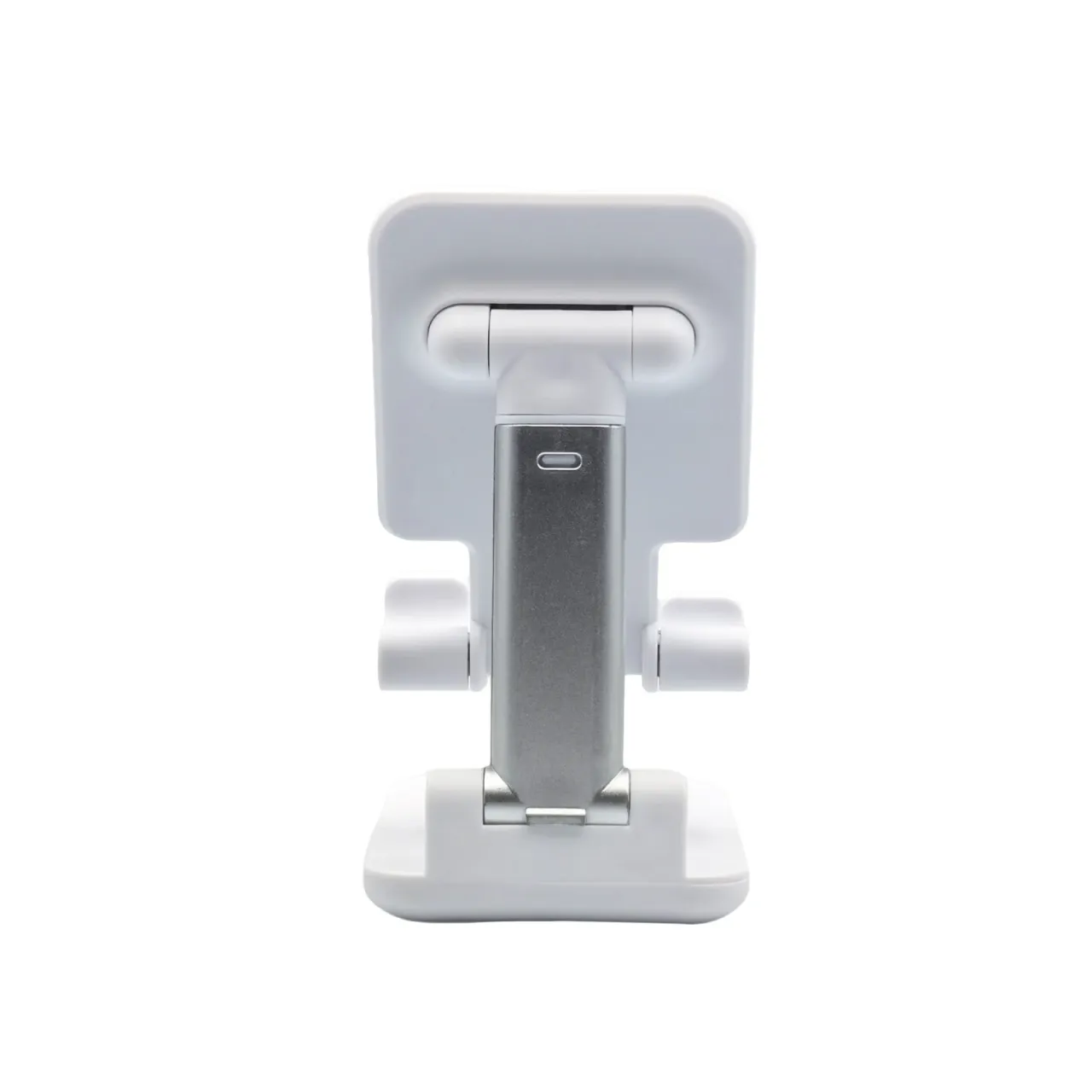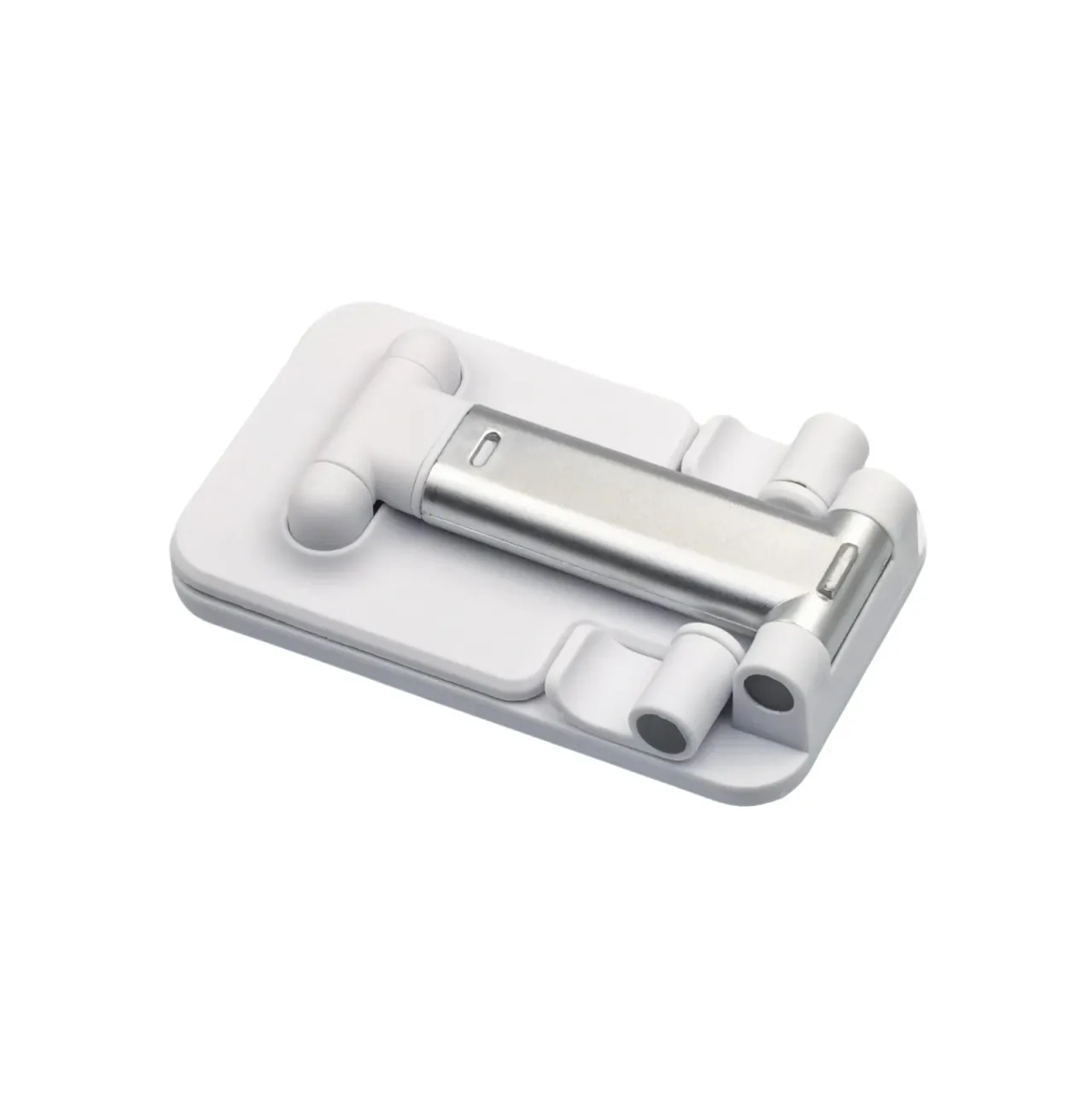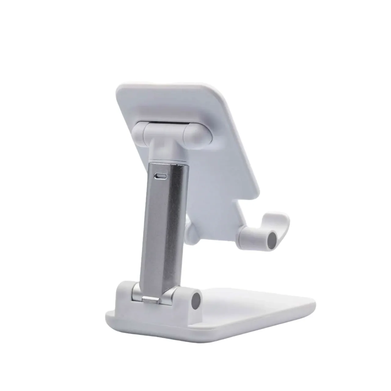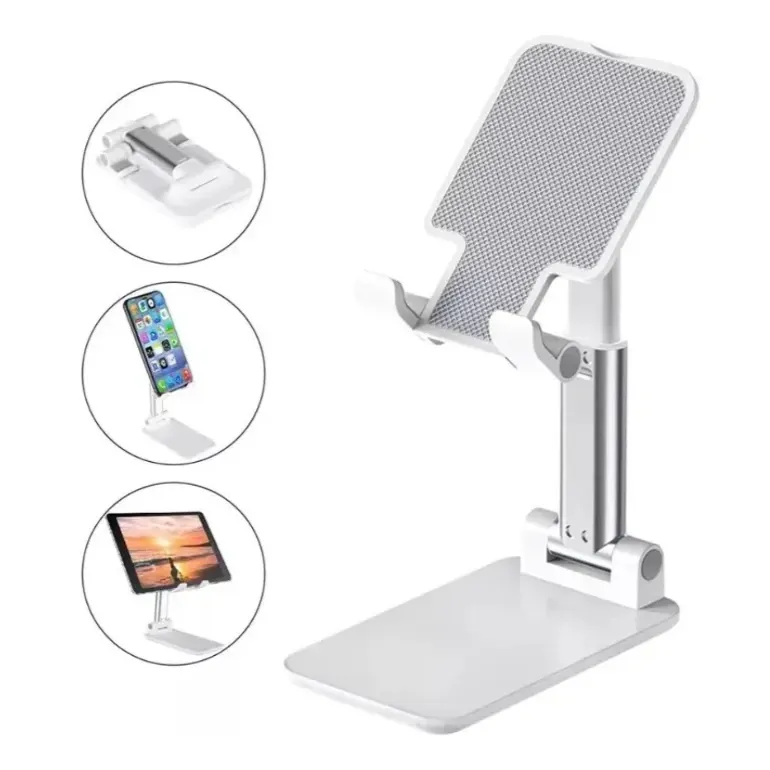 Soporte plegable de escritorio para celular y tablet, con altura e inclinación regulables que permiten una posición cómoda y ergonómica. Su base antideslizante y estructura reforzada brindan gran estabilidad, mientras que su diseño compacto lo hace ideal para videollamadas, oficina, estudio o viajes.