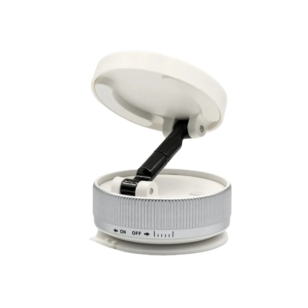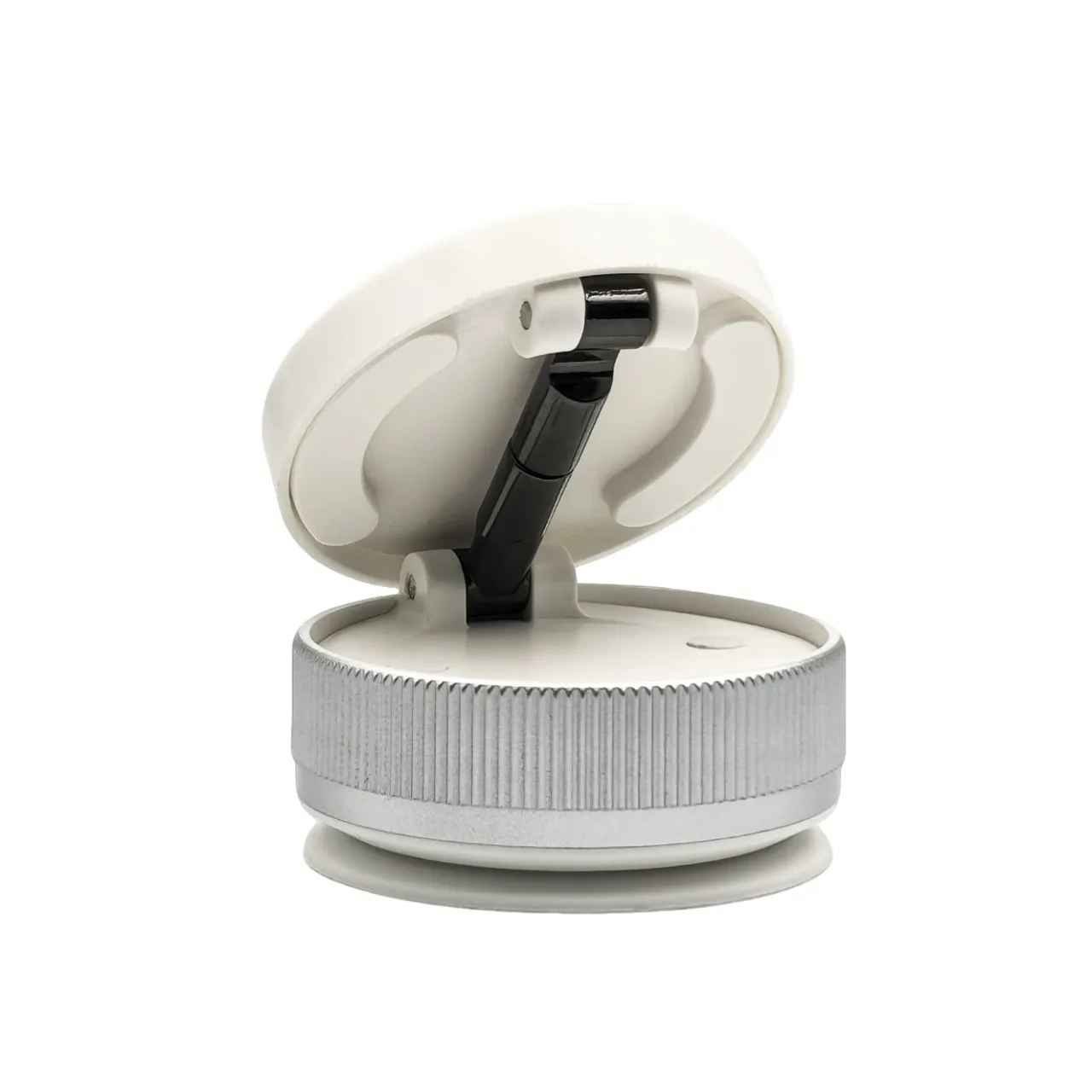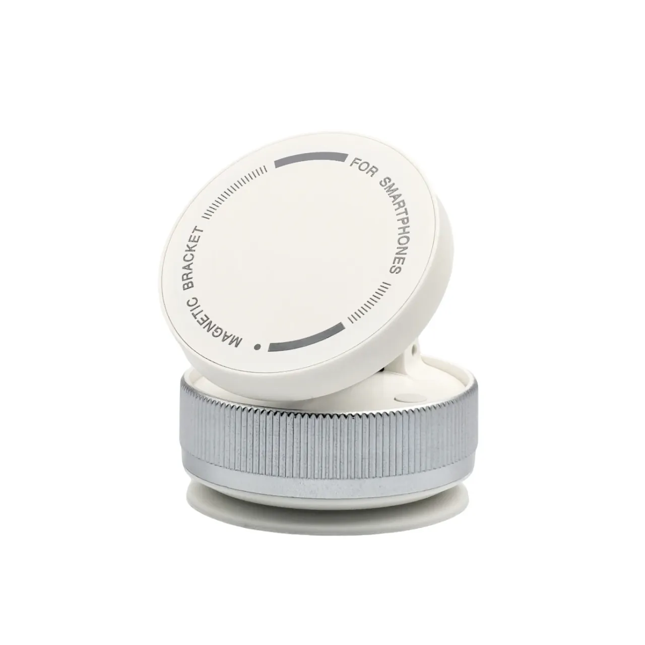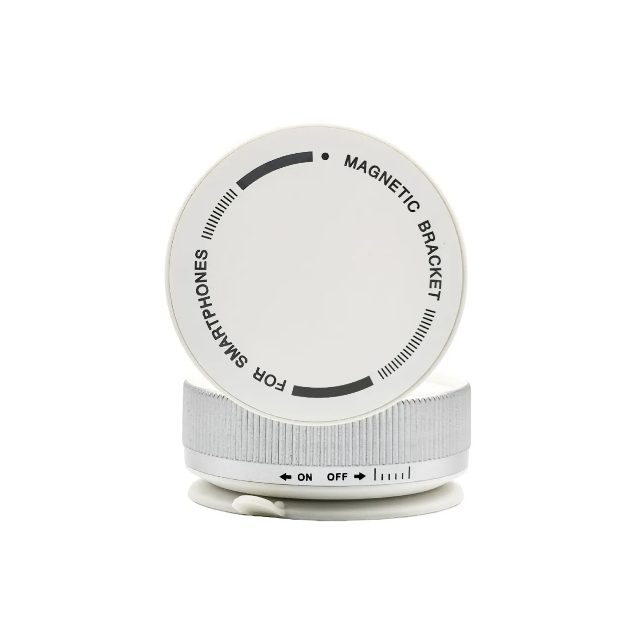 Soporte magnético universal blanco con base a succión y rotación 360°. Ideal para auto, escritorio o pared. Incluye imán,  y kit de limpieza. Medidas 3.4 × 6.6 cm.